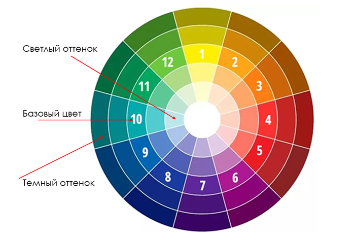 С первым пунктом все достаточно понятно и ясно. Если к базовому цвету постепенно добавлять белый цвет, то будем получать светлый оттенок, если же черный цвет — будем получать темный. Рассморим эти характеристики на примере, обратившись к уже знакомому нам цветовому кругу Иоганесса Иттена: