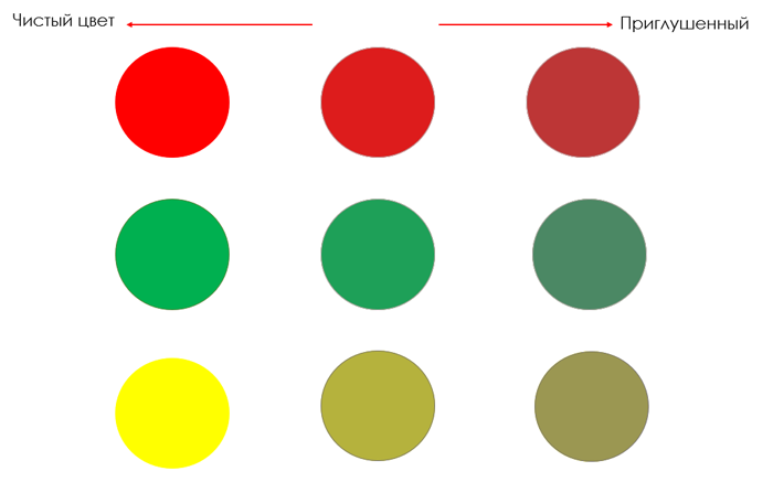 Теперь поговорим о чистых и приглушенных тонах. Здесь тоже все довольно-таки несложно. К базовому цвету мы добавляем серый оттенок (серый цвет — это смесь двух ахроматов — черного и белого — и также является ахроматом). Рассмотрим на примере красного, зеленого и желтого цветов — классического светофора.