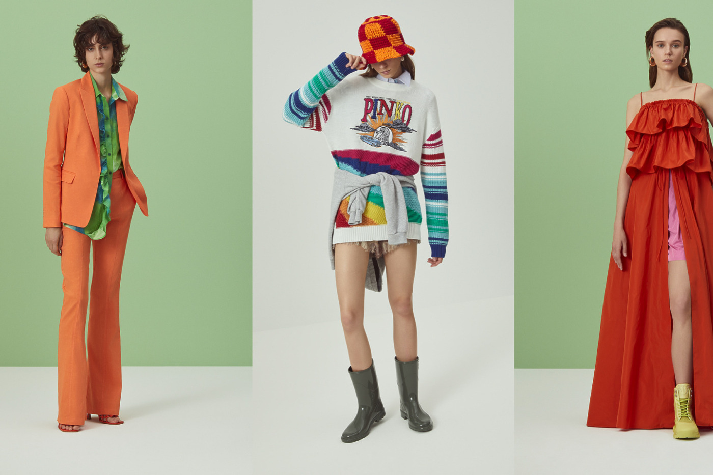 В этом сезоне строгий пиджак будет отлично смотреться с трениками, а спортивный костюм можно смело дополнить романтичными босоножками — берем пример с Pinko.