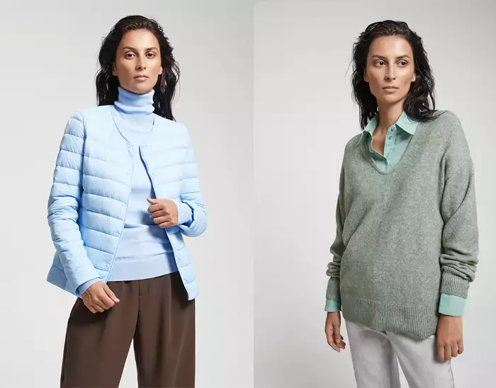 Идеальный весенний образ — джемпер с заниженной линией плеча за 1299 рублей и блуза мятного цвета за 1099 рублей. Дополняют образ светло-серые укороченные джинсы-бананы за 1 449 рублей.