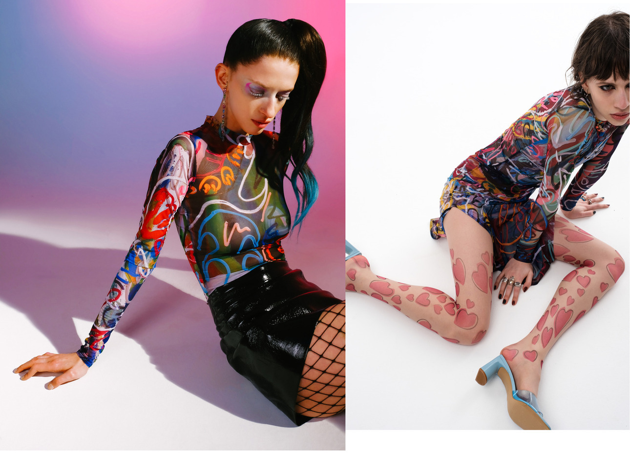 А еще — сексуальные вещи из сетки с кастомизированными принтами специально нарисованных маслом полотен, короткие кроп-топы с игрушечными мишками и прочими сказочными зверями, костюм ярко розового цвета из эко-кожи с ультра мини-юбкой и длинный черный плащ из винила.