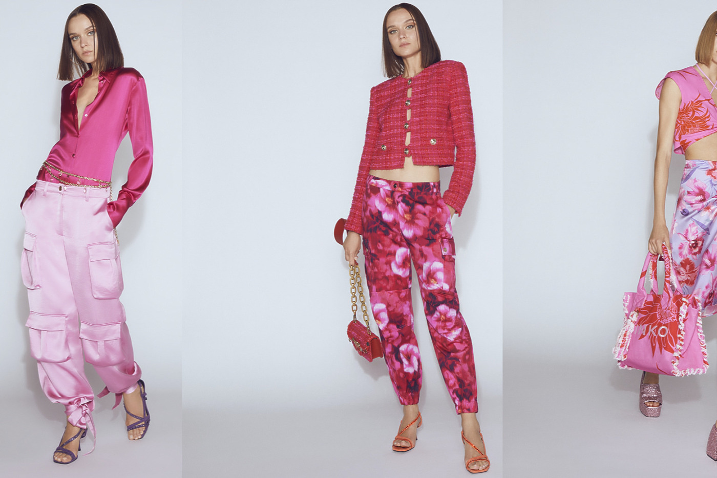 Строгий костюм, брюки карго, юбки, платья и топы — можно одеваться в розовое с ног до головы, смело миксуя оттенки и принты. Как, например, в летней коллекции итальянского бренда Pinko.