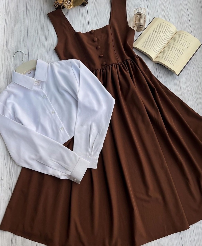 Короткий сарафан в стиле high school и классическая белая рубашка станет оригинальным комплектом для весенних прогулок. Стилист: «Далеко не каждый дресс-код пропустит такой дерзкий образ, но вечером или для дневного выхода в кафе он подойдет отлично». Подхватывайте тренд и задавайте моду в своем окружении!