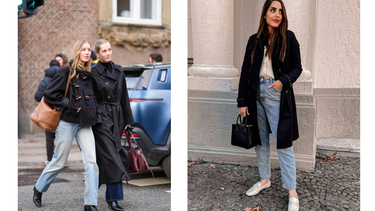 Традиционный тренч, выполненный в черном цвете, подчеркивает такие простые базовые вещи, как джинсы с прямыми штанинами и ботильоны на каблуке.