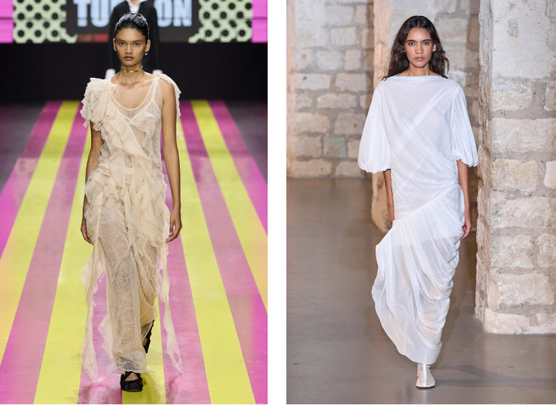 Неожиданные слои ткани, которые мягко и таинственно обволакаивают фигуру. Они скрывают тело, но на самом деле подчеркивают хрупкость и женственность. Прямая ассоциация — нежный прекрасный цветок.