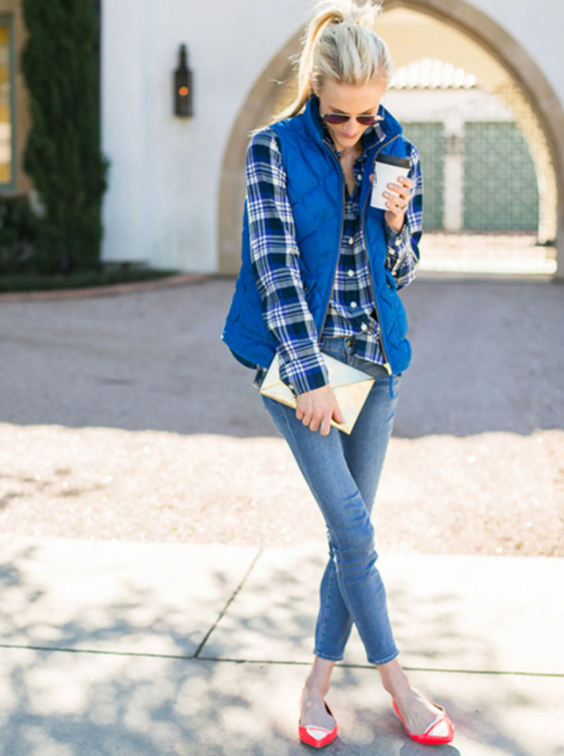 Когда похолодает (все же осень уже не за горами!), надевайте жилет без рукавов. Джинсы — скинни или бойфренды — позволят создать идеальный ансамбль для работы в будни или для прогулки в воскресенье.