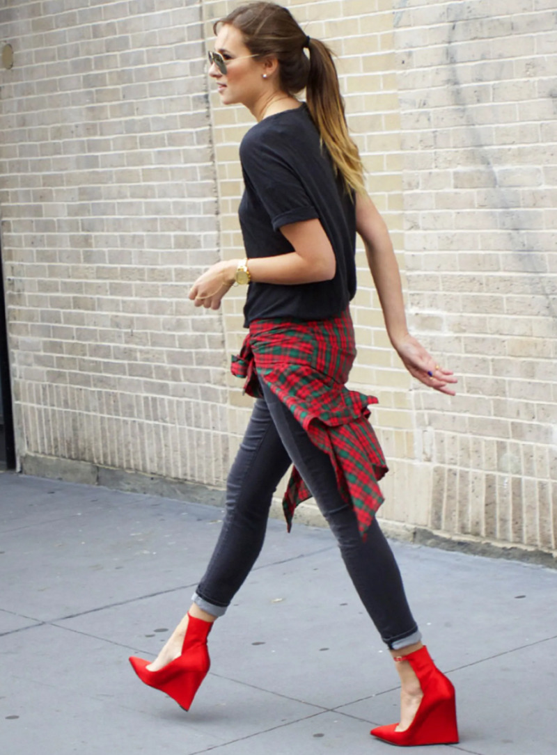Завяжите яркую клетчатую рубашку на талии, чтобы вывести свой образ с джинсами и футболкой на новый уровень. «Для повседневного образа подойдут кеды или кроссовки (получится полная аутентичность стиля), а для более гламурного выхода выбирайте туфли на каблуке», — советует стилист Маша Ведерникова.