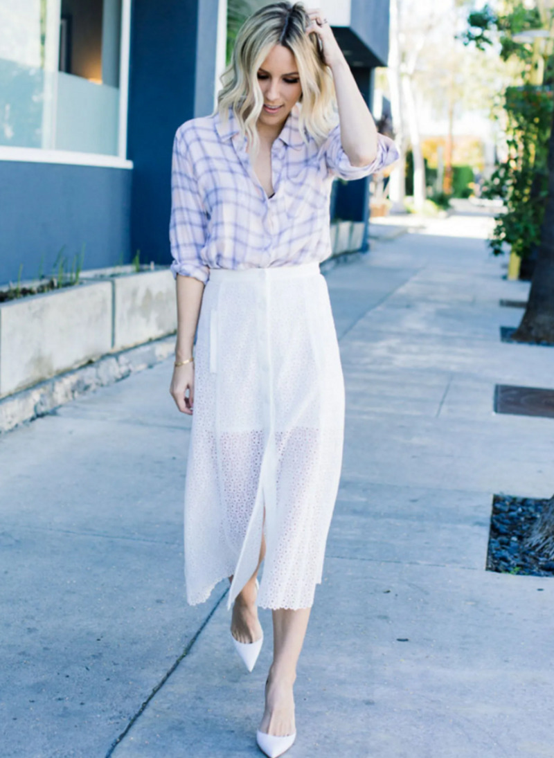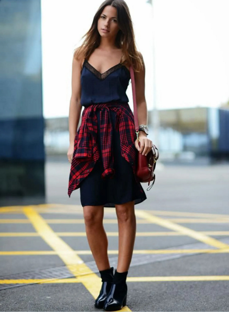 Для более нарядной вечеринки выберите клетчатую рубашку более светлого цвета и заправьте ее в кружевную юбку средней длины. «Тут, конечно, нужны шпильки. Если прохладно, можно набросить вечерний вариант блейзера — например, из атласа или бархата. И пусть он будет однотонным», — предупреждает Маша.