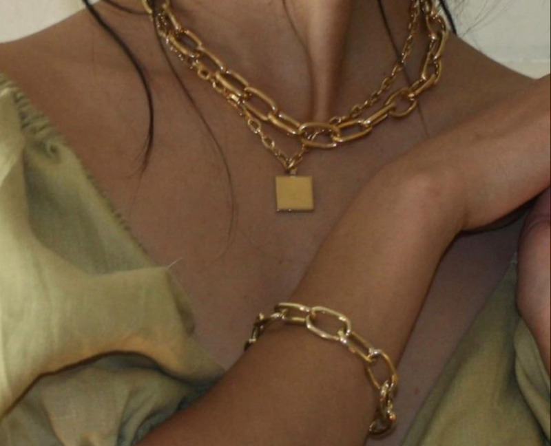 Наиболее трендовыми являются необычные варианты цепей — матовые, оригинального плетения, с кристаллами или цветными вставками, с крупными звеньями. Такой аксессуар можно надеть с джинсами или пиджаком оверсайз (или же выбрать классический способ стилизации — носить на шее).