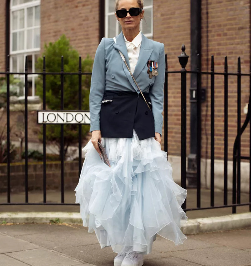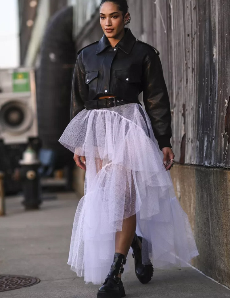 Балетная воздушность юбки отлично сочетается с брутальностью фактур: косуха или укороченная кожаная куртка создадут рок-н-ролльное настроение, а джинсовая куртка придаст образу расслабленности. Выбирайте юбку средней длины (миди), чтобы балансировать пропорции и не утяжелять образ.