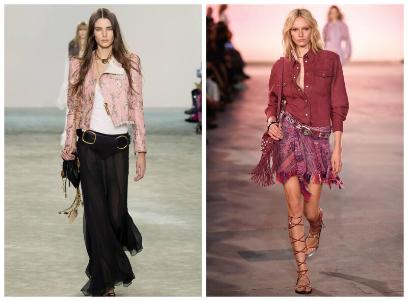 Isabel Marant в своем показе весна-лето 2025 отлично демонстрирует образы в стиле мотобохо, где представляет моделей в объемных кожаных куртках в байкерской тематике с удобной открытой одеждой из натуральных тканей в этнических мотивах. Добавляет серьги-кисточки, легкую небрежность на голове, а обувает моделей не в привычные нам подиумные каблуки, а в удобную обувь на плоском ходу в виде открытых босоножек до колена или сапоги. Кажется, что модели легко парят над подиумом.