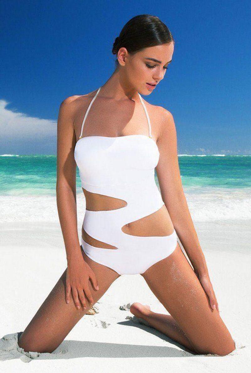 - На стройных девушках отлично будет смотреться монокини с вырезом на уровне талии.