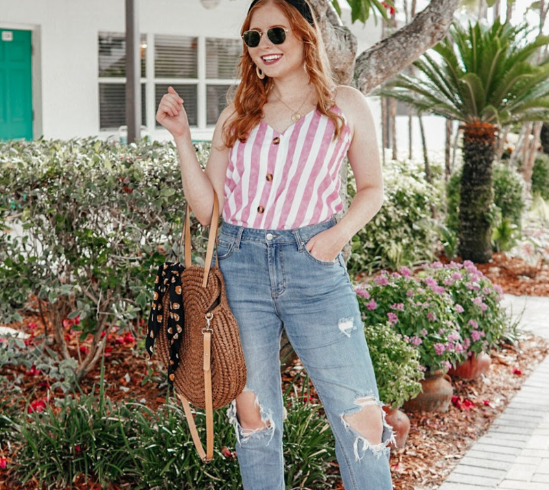 Широкополая шляпа, солнцезащитные очки с яркой оправой, льняная сумка, украшения в стиле бохо или морская тема — все это придает джинсам отпускной флер. Даже простой образ «джинсы и белая майка» становится стильным, если добавить крупные серьги, по-прежнему актуальную панамку-ведро или классический берет, соломенную сумку, балетки — и хорошее настроение.
