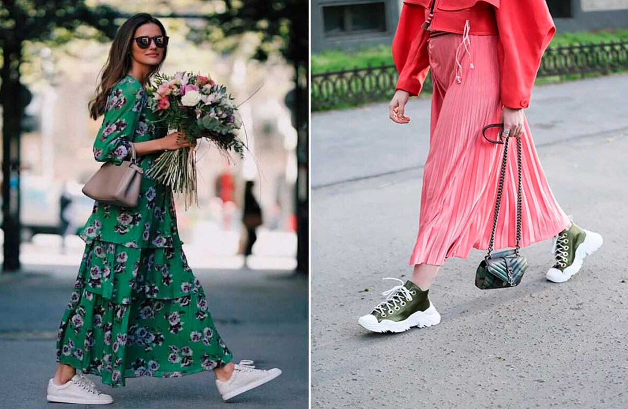 Мягкие трикотажные или струящиеся миди-юбки прекрасно дружат с кедами, создавая тот самый «парижский» образ — непринужденный, но очень элегантный. «Особенно хорошо смотрятся сочетания с платьями-рубашками, платьями с запахом или в стиле бельевого кроя. Выбирайте кеды на тонкой подошве и избегайте массивных моделей — чтобы сохранить легкость и не перегрузить силуэт», — советует стилист.