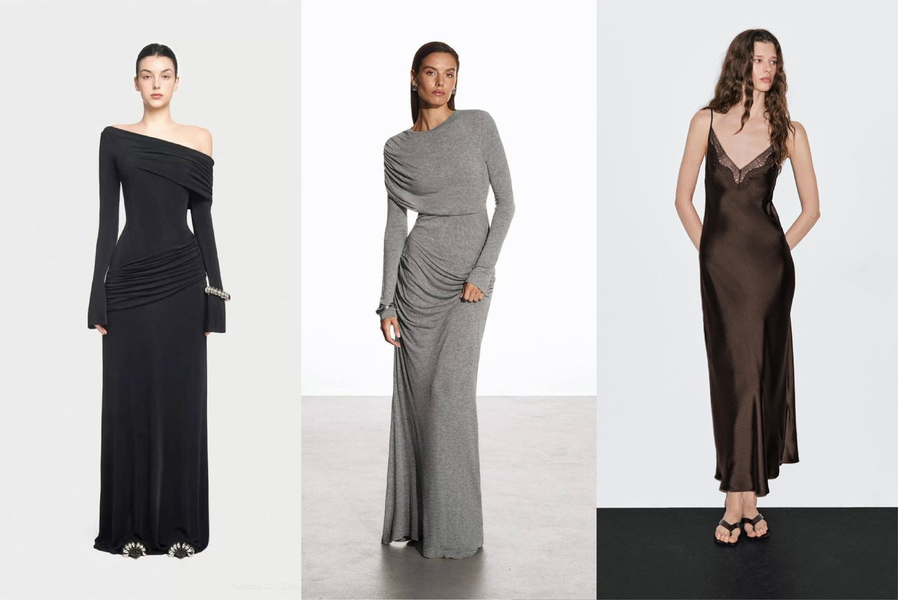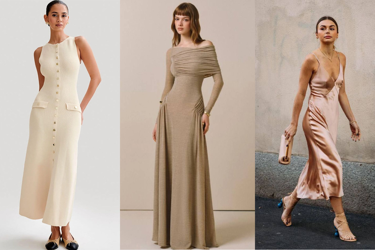 Такое платье может держаться на четкой линии плеч, мягком поясе, аккуратных драпировках или красивом вырезе — неважно. Главное, чтобы форма была понятной и «живой», а ткань — матовой или с легким благородным блеском.