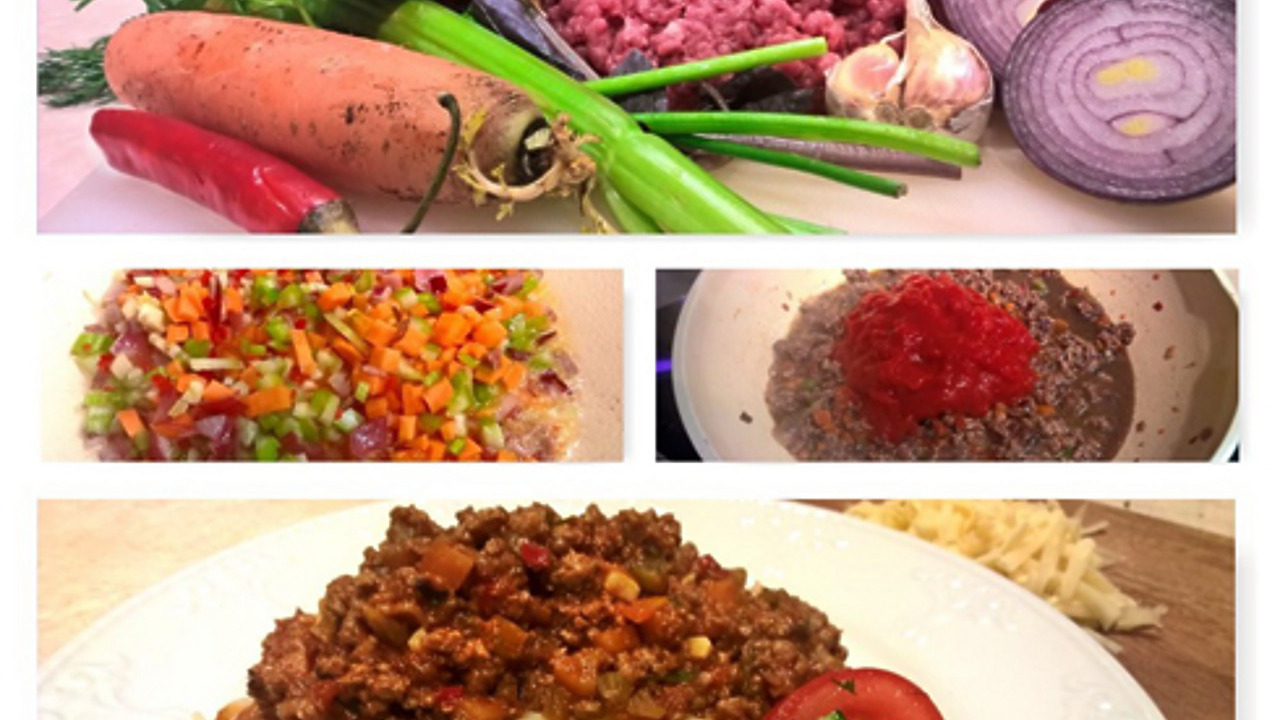 Шинкуем лук, сельдерей, морковь, перец чили, если есть желание. Все это традиционно пассеруем в оливковом масле. Далее используем резаные консервированные томаты. Впрочем, если есть возможность использовать натуральные, не стесняйтесь. После того, как вскипели помидоры, добавляем коровий фарш, щепоть сахара, стакан красного вина. Тушить желательно не меньше часа, по необходимости подливая воды или бульона, в конце добавить петрушку и базилик, измельченный чеснок, соль, выключить и пусть стоит, пока варятся спагетти. Посыпаем тертым пармезаном или любым твердым сыром.