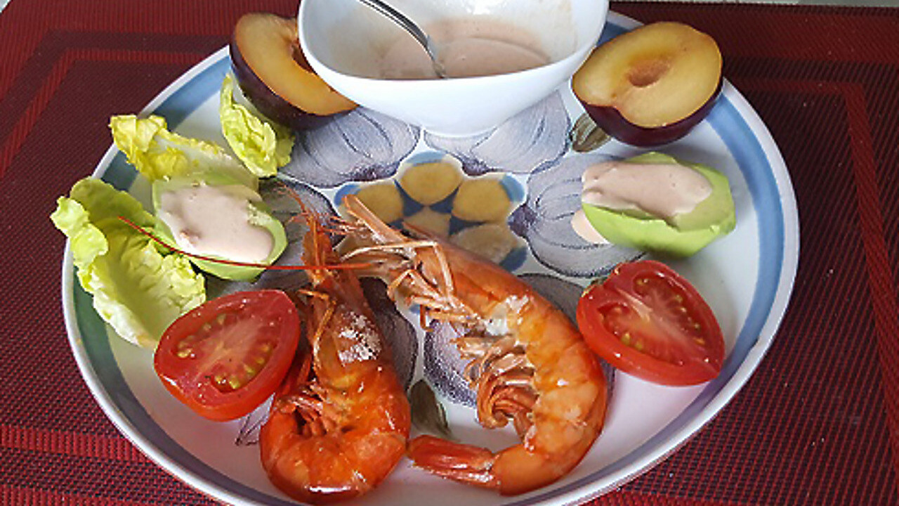 Креветки отварить или запечь на гриле. Авокадо разрезать вдоль напополам и вынуть косточку. Выложить на тарелку вместе с креветками и гарнировать вашими любимыми овощами или фруктами. Креветки и авокадо отлично сочетаются как с зеленым салатом, так и с ломтиками апельсина, дыни или яблока.