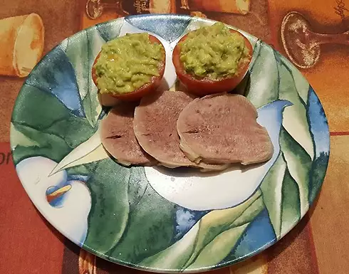 Спелые авокадо разрежьте пополам, удалите косточку, ложкой достаньте мякоть. Выдавите лимонный сок, чеснок пропустите через пресс, добавьте измельченный перец (если не найдете, просто добавьте кайенского молотого перца по вкусу), лук и соль. Перемешайте и сразу подавайте. Мексиканцы едят этот соус с с кукурузными чипсами (начос) или с пшеничными или кукурузными лепешками (тортильяс). А вы можете подать его к отварному языку (как на фото) или мясному блюду.