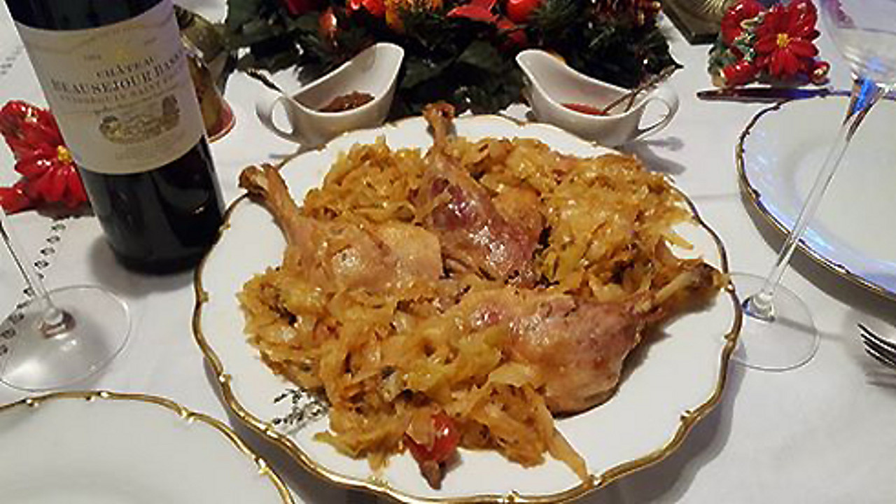 Очень хорошо утиное конфи сочетается с тушеной капустой. Смешайте свежую и квашенную капусту в сочетании 1 к 1. Классическим считается подача с обжаренным на сливочном масле мелко порезанным луком шаллотом.