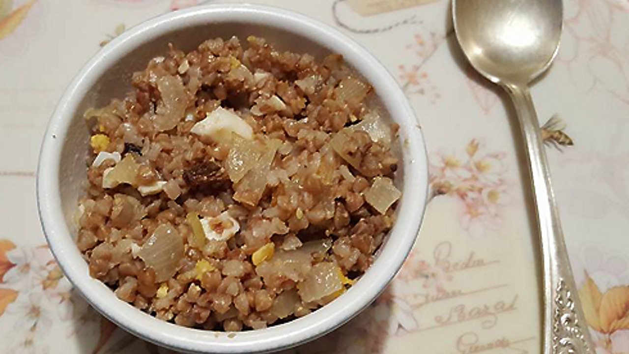 Теперь приготовим заправку. Отварите яйца вкрутую, мелко порубите. На сливочном масле пережарьте мелко порезанный репчатый лук. Заправьте готовую кашу рубленым яйцом и обжаренным луком, только после этого посолите и подавайте на стол.