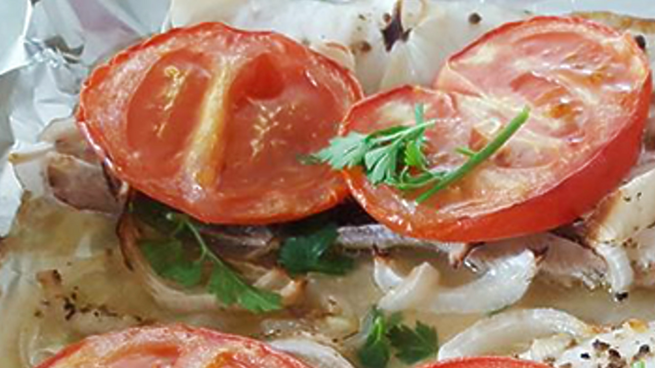 Духовку разогрейте до 200 градусов. В стеклянную форму положите рыбное филе, сверху выложите помидоры, нарезанные кружочкам, и лук полукольцами. Посолите, поперчите и сбрызните оливковым маслом. Запекайте 20−25 минут и подавайте на стол, посыпав свежей зеленью.