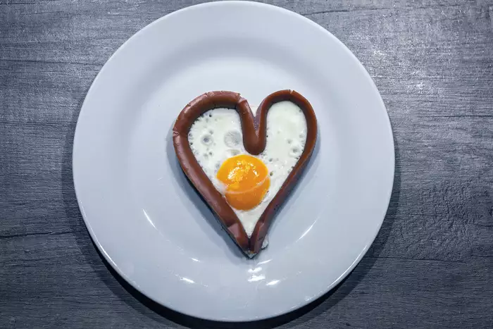Способ приготовления: каждую сосиску разрезать вдоль, не доходя до конца 1–1,5 см. Разрезанную сосиску вывернуть наизнанку. Края сосиски скрепить зубочисткой. Должно получиться сердечко. На разогретую сковороду капнуть растительного масла, а затем добавить кусочек сливочного. Выложить сосиски-сердечки, поджарить с одной стороны, перевернуть. Вбить в каждое сердечко по небольшому яйцу. Посолить, поперчить. Перед подачей вынуть зубочистки из сосисок. Из обычного хлеба ножом вырезать сердечки, сделать гренки или тосты. Украсить блюдо зеленью и овощами, какие есть в холодильнике.