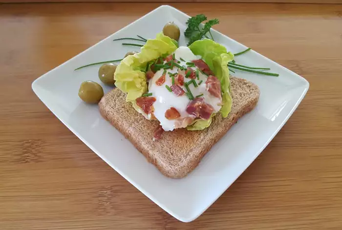 Поджарьте хлеб в тостере, выложите пару ложек сыра «Домашний», или подсоленный творог (крем-чиз и т. д.), на него — лист салата, аккуратно положите яйцо пашот, посолите, поперчите и посыпьте сверху рубленым хамоном и зеленью. Положите 3—4 оливки. Если у вас соленый творог и бекон, например, то яйцо можно не солить — соли будет достаточно.