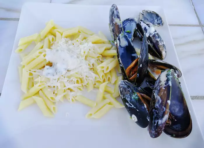 Если решили на гарнир использовать пасту или отварной рис, полейте гарнир соусом от мидий, а пасту посыпьте тертым пармезаном.