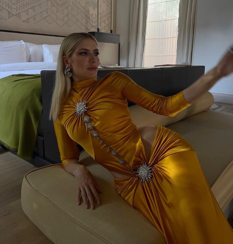 Ассоциация с богиней и принцессой как нельзя кстати, если платье предназначено для специального, торжественного случая. Еще больше пафоса и роскоши образу придаст ткань с эффектом металлик - сиять так сиять. Для марокканской ночи Елена Перминова выбрала золотое драпированное платье со сверкающими стразами по линии сборки. Виктория Лопырева на той же вечеринке появилась в золотом статуарном наряде с драпировкой в виде объемной розы на талии.