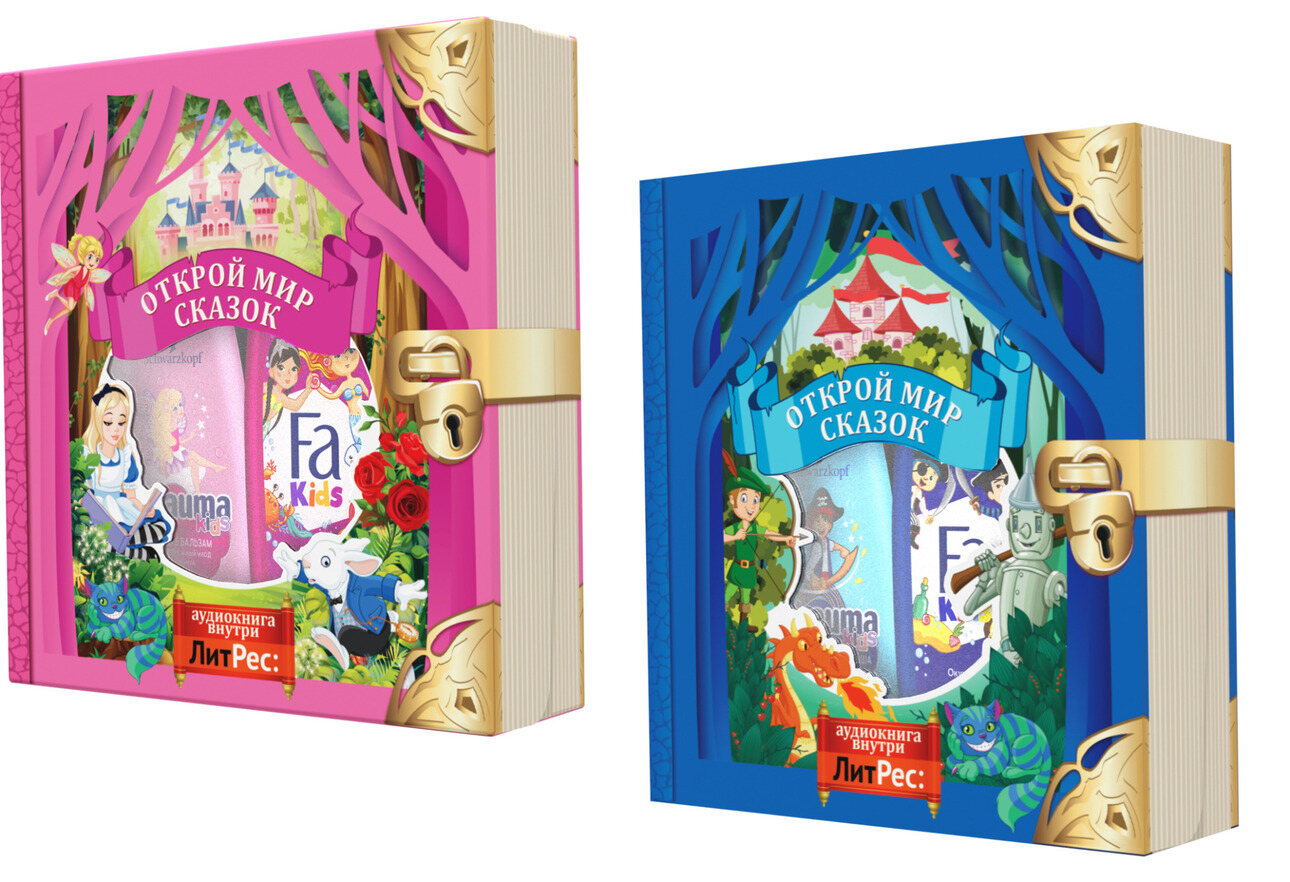 Внутри этих двух «книжек» спрятались очень полезные подарки: детские наборы Schauma + Fa Kids, куда входят средства по уходу за кожей и волосами. В «книжке» синего цвета, предназначенного для мальчиков, гель для душа и шампунь с «морским» ароматом. В розовой коробке — гель и шампунь пахнут свежими ягодами.