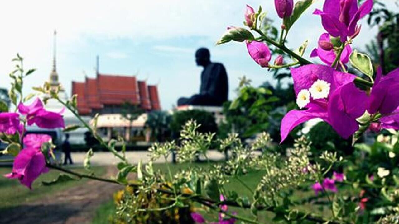 Wat Kaeo Manee Si Mahathai переводится как Храм сидящего монаха. Если смотреть с дороги, поначалу кажется, что это — обычный буддийский комплекс: большой, красивый, умиротворяющий. Пока взгляд не упирается в гигантского монаха темно-серого цвета высотой с пяти — семиэтажный дом. Выглядит эта фигура в первый момент даже пугающе. Кто это? Что он здесь делает? Местные жители, с трудом изъясняющиеся по-английски, смогли объяснить только, что эта статуя монаха — самая большая в Таиланде. А еще показали нам гонг, расположенный поблизости. Достаточно загадать желание и потереть этот гонг. Если услышите глубокий прозрачный звук, значит душа ваша чиста, а желание обязательно сбудется.