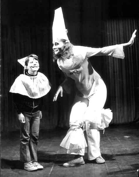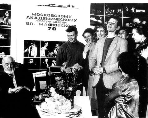 3. «В детские годы я занимался в Театре юного москвича, а после школы, обучаясь в МГУ, стал играть в студенческом театре. Там мне и посоветовали поступить в театральный институт. Я решил попробовать, тем более и мои друзья по студии собирались попытать счастья. Я подал документы в три вуза и везде прошел. Выбрал ГИТИС, поскольку там преподавал поразительный мастер Андрей Александрович Гончаров. Именно он сделал из меня настоящего артиста. Но учился я у него не только профессии, но и человеческим качествам. На этой фотографии запечатлен момент, когда мы, третьекурсники, выступали на семидесятилетнем юбилее Театра имени Маяковского, который возглавлял Гончаров и где я начал служить, получив диплом».
