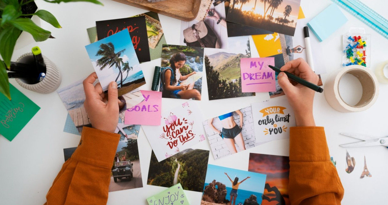 Визуальный ряд — это ключевой элемент карты желаний. Они должны быть яркими и вызывать положительные эмоции. «Подберите картинки, которые точно отражают ваши желания или ассоциируются с ними. Используйте журналы, интернет, открытки — любые ресурсы, где можно найти подходящие изображения», — советует Катерина.