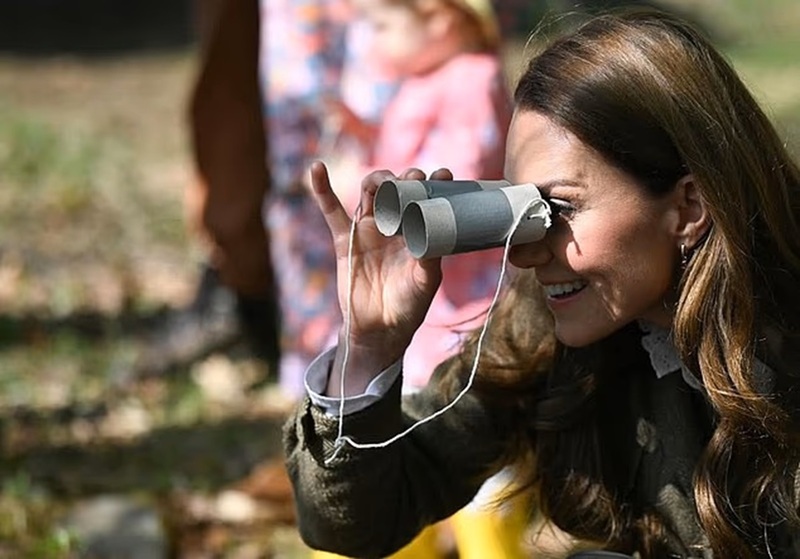 Апрель — легкомысленный момент во время визита на Гебридские острова к 14-й годовщине свадьбы. Кэтрин, в твидовом наряде, заглядывает в самодельные картонные бинокли на островах Малл и Айона, где они — лорд и леди островов.