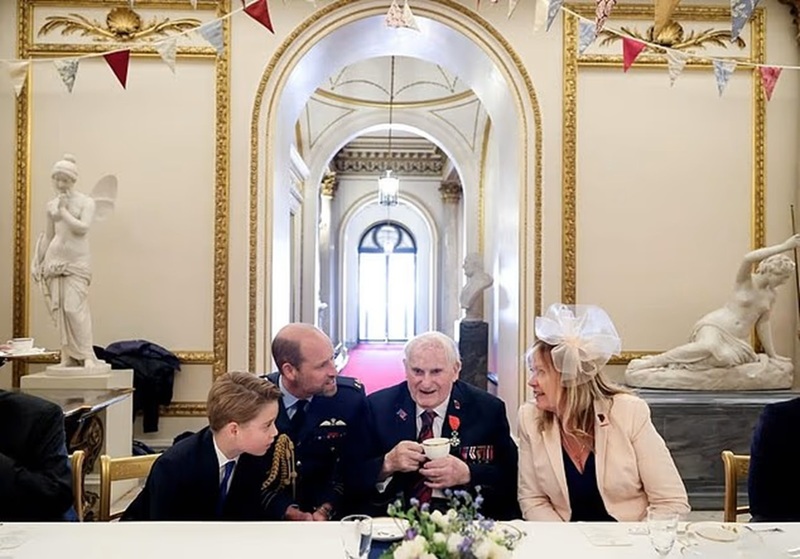 Май умиляет отцовским теплом: Уильям и принц Джордж слушают ветерана за чаем в Букингемском дворце на 80-летии Дня Победы в Европе.