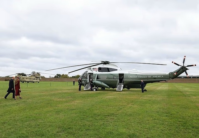 Сентябрь — совместный прием президента Трампа в Виндзоре: супруги идут к вертолету Marine One, где Уильям шутит, указывая на короля: «Это мой отец».