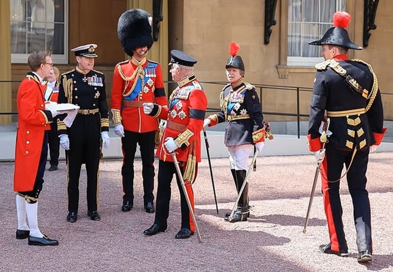 Июнь фиксирует редкий момент короля Чарльза: на параде Троопинг зе Колор он, принцесса Анна и Уильям в церемониальной форме Уэльской гвардии делят миг непринужденности — принц носит черную траурную повязку в память о жертвах авиакатастрофы Air India.
