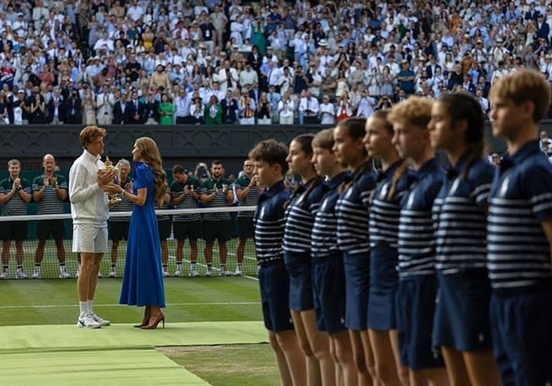Июль сияет триумфом: Кэтрин в королевском синем вручает трофей Джаннику Синнеру на финале Уимблдона.