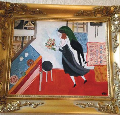 — Он был в тихом восторге, не ожидал такого подарка. Картину я писала три дня, по утрам, когда муж уходил на работу. Это была интерпретация известной картины Марка Шагала «Над городом», там двое влюбленных плывут в небесах. Я ее назвала «На седьмом небе».