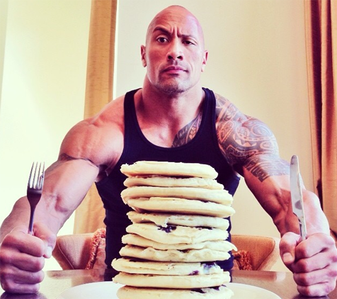 Актер и рестлер Дуэйн Джонсон всегда ест очень много. Но исключительно «правильную» еду, богатую белками и полезными углеводами. Однако есть у Дуэйна одна слабость — это блины. И в свои загрузочные дни кинозвезда позволяет себе насладиться огромной порцией любимого лакомства со сладким сливочным соусом и свежими ягодами.