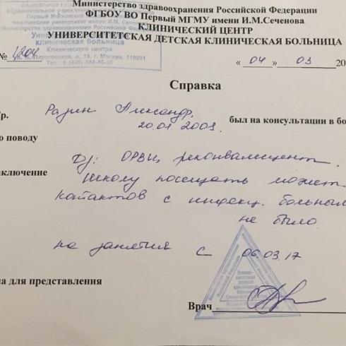 Андрей опубликовал на своей странице в «Инстаграме» справку, которую дали его сыну в начале марта. Врачи поставили мальчику диагноз ОРВИ, но, тем не менее, выписали его и разрешили посещать занятия.