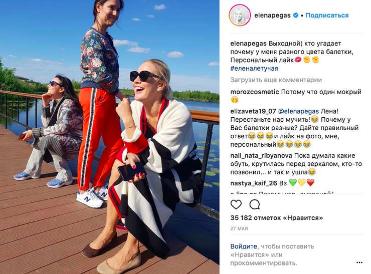 На фото, которое появилось в ее инстаграме, Лена Летучая запечатлена в балетках разного цвета. Для девушки с репутацией иконы стиля — довольно странный образ, видимо, сама Елена это понимает.
