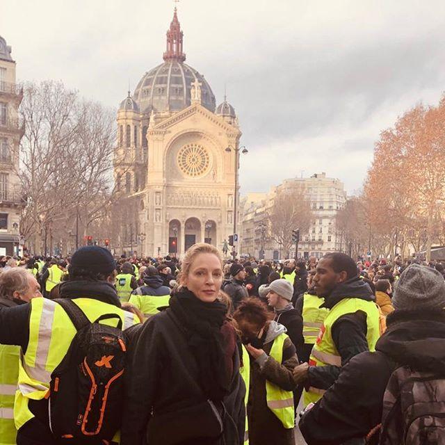 Американская актриса Ума Турман оказалась в центре беспорядков, охвативших всю Францию. Люди в желтых жилетах протестуют против роста налогов и цен на бензин. В своем «Инстаграме» звезда выложила снимок сделанный в Париже.