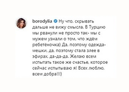 Тем удивительнее, что в одном из комментариев к своей фотографии Ксения на очередной вопрос про беременность неожиданно написала: «Скрывать дальше не вижу смысла. В Турцию мы рванули не просто так. Узнали, что ждем ребятеночка. Поэтому одежда-мешки и стала злее в эфирах. Желаю всем испытать такое же счастье».