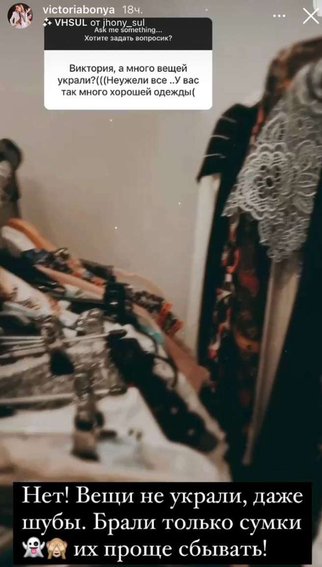 На фото, которые опубликовала Боня, видно, что в квартире царит беспорядок. Видно, что грабители искали ценные вещи. По словам Виктории, в итоге воры взяли только сумки. Поскольку все они брендовые и дорогие, то стоят очень дорого. "250 тысяч евро — полная стоимость того, что они унесли, и это только по приблизительным подсчетам, так как было огромное количество дорогих сумок', — рассказала светская львица.