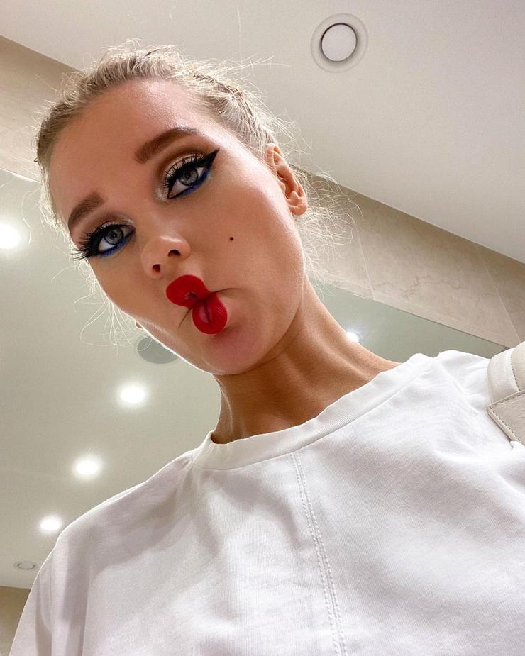 Похоже, что Настя восхищается модой эпохи Мерилин Монро, поэтому на выход решила повторить макияж дивы с графичными стрелками. Правда для внешности звезды ее визажист удачно выбрала глубокий серый цвет вместо классического черного — он органичнее сочетается со светлыми глазами и кожей блогера. Выполнить такой макияж можно, если у вас не нависшее веко. Возьмите подводку со стемпингом, поставьте уголок стрелки и дорисуйте ее обычной подводкой-фломастером. Вытяните стрелку кистью с каплей консилера, чтобы сделать макияж чистым.