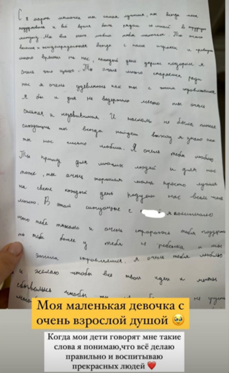 «Ты пример для многих людей и для нас тоже. Ты хорошая мама, просто лучшая на свете. Каждый день радуешь нас всем, чем можно. В этой ситуации с папой, понимаю, что тебе тяжело, и очень стараюсь тебя поддержать. Тем более у тебя четыре ребенка, и ты с этим справляешься. Очень тебя люблю и желаю, чтобы твои идеи и мечты сбывались», — написала девочка.