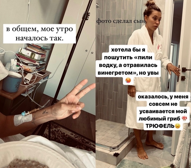 Потом знаменитость рассказала, почему она себя ужасно чувствует. «А накануне я была радостной. Съела девять блюд с трюфелем, выпила два бокала вина и один шот текилы, час танцевала и в 23:30 уже была дома. А это фото сделал сын. Хотела бы я пошутить „пили водку, а отравились винегретом“, но увы. Оказалось, у меня совсем не усваивается мой любимый гриб трюфель», — с грустью сообщила Регина.