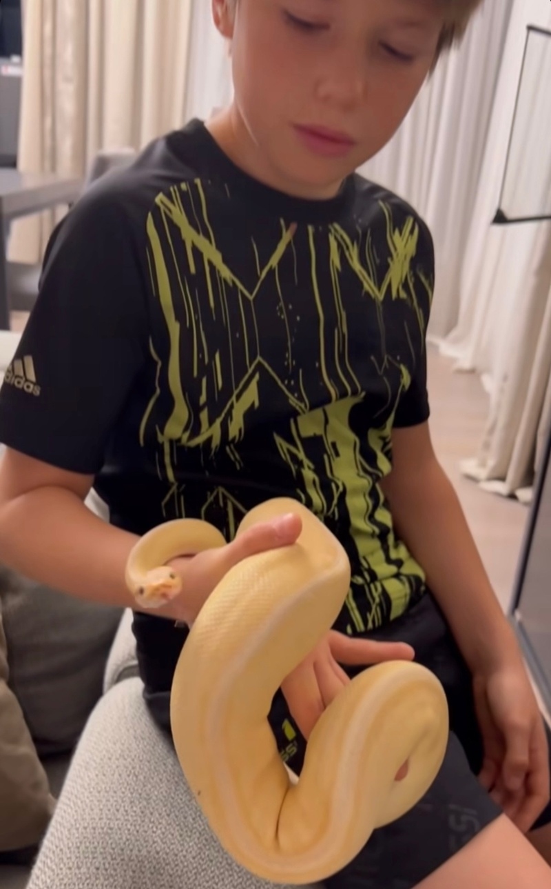 Так, телеведущая Юлия Барановская подарила своему младшему сыну желтую змею. Мальчик новому любимцу очень рад, а вот сама звезда старается держатся от него подальше.