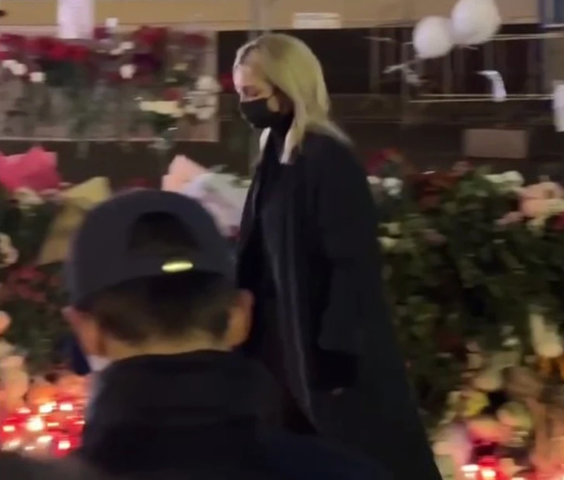 Телеведущая постаралась не привлекать внимания к своей персоне. Она выбрала черное широкое длинное пальто, а на лицо надела черную маску. После того, как она возложила цветы у стихийного мемориала, поспешила удалиться.